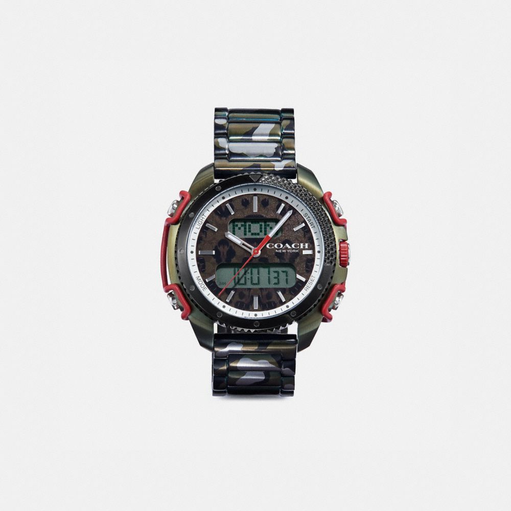 Built for adventure, this limited edition C001 is a sporty, multi-function watch made for life on the go. Detailed with our camouflage-inspired print on the dial and bracelet, this olive iconic plated analog and digital timepiece has exciting features including location name and time display for 48 cities worldwide, stopwatch and countdown timers, automatic calendar and more. It's finished with a removable red case guard for an optional pop of color.