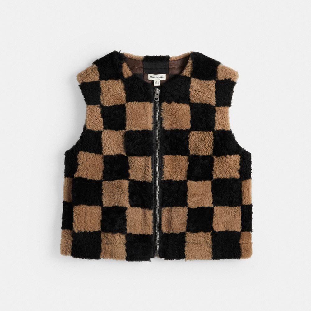 In(vest) in the future of fashion: this all-gender zipper-front vest is made by reimagining the 100% shearling scraps from our own production waste. It features a checkerboard pattern on front and back body, a matching knit rib pattern on the armhole and V-neck, as well as a Coachtopia logo embroidered on the front panel.