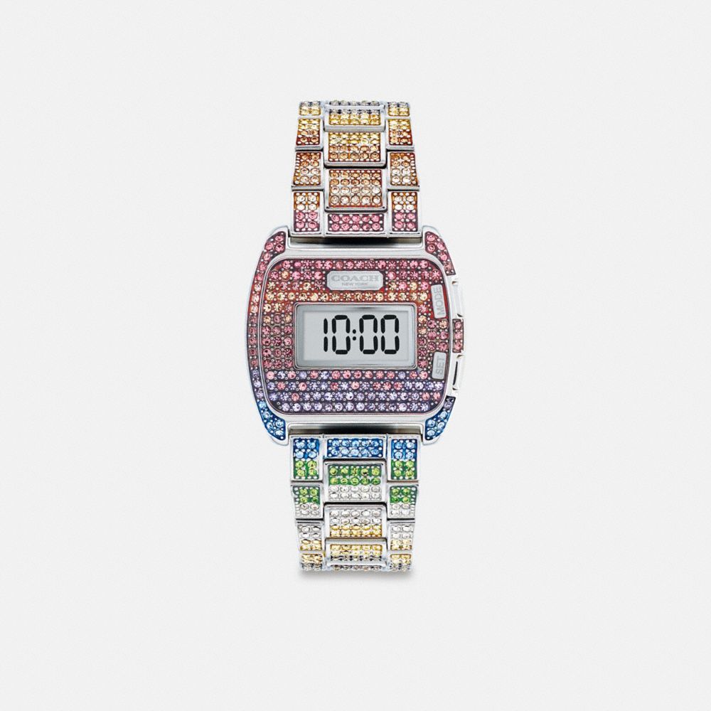 A retro-cool design, Darcy is a great-looking watch with a sophisticated shape and an easy-to-read digital display. This stainless steel bracelet design sparkles with allover pavé crystals in pastel rainbow hues on the dial, bezel and bracelet.