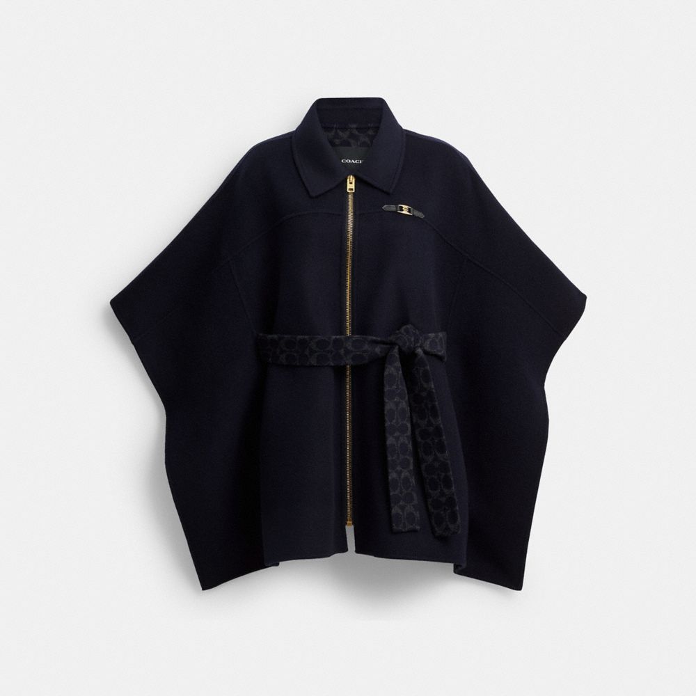 An elegant cold weather style, this zip-front cape is crafted of a double-faced wool-blend with a beautiful drape and smooth, even surface on both sides. Featuring our Heritage C Plaque and our Signature on the reverse for an iconic Coach touch, the relaxed-fit silhouette is finished with a belted waist and slip pockets.