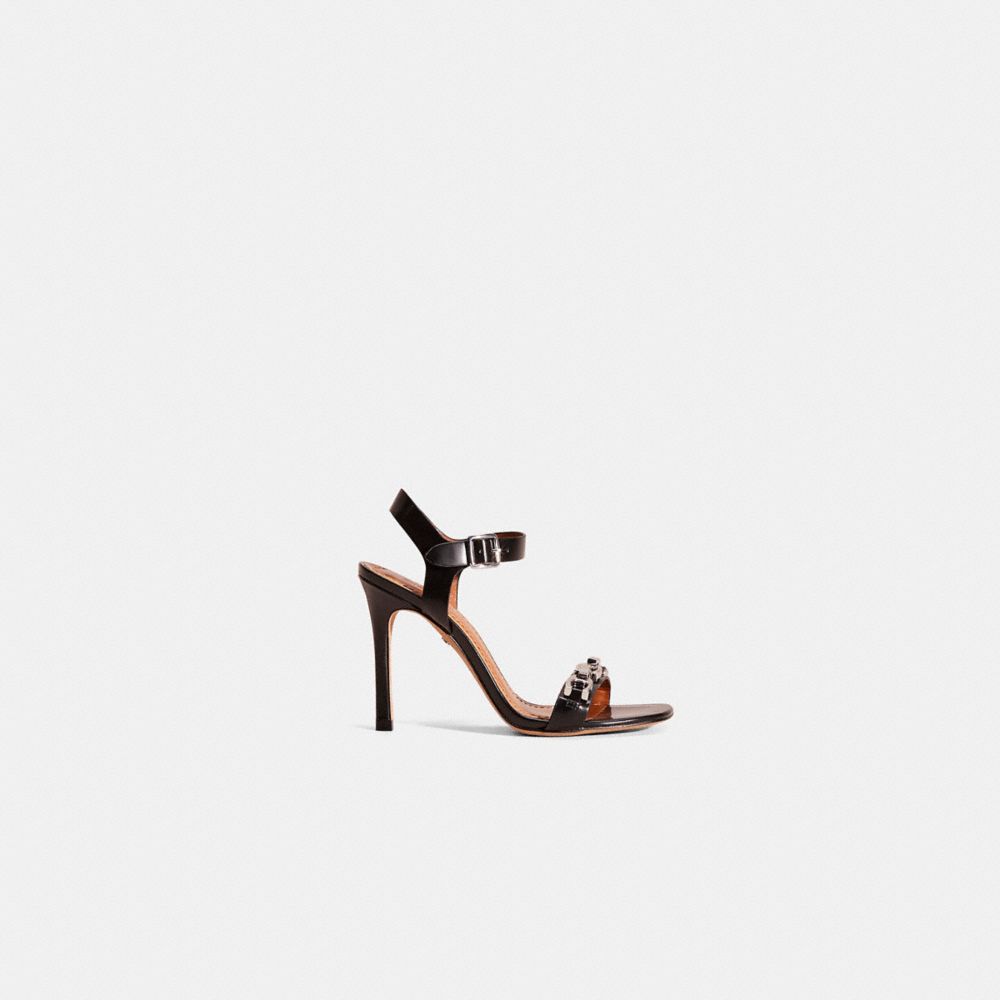 Crafted of smooth leather, this stiletto heel sandal is a versatile pick for day or night. Signature Chain hardware adds a modern take on Coach heritage.