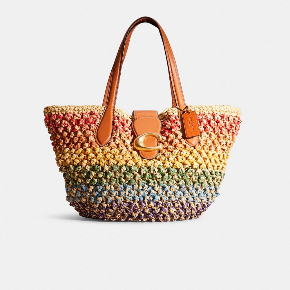 This small tote is crafted of individually dyed pieces of straw woven and assembled in a bright rainbow-hued pattern. Finished with leather handles and a removable zip pouch that can be carried separately, the versatile carryall secures with a snap closure featuring our Signature hardware.