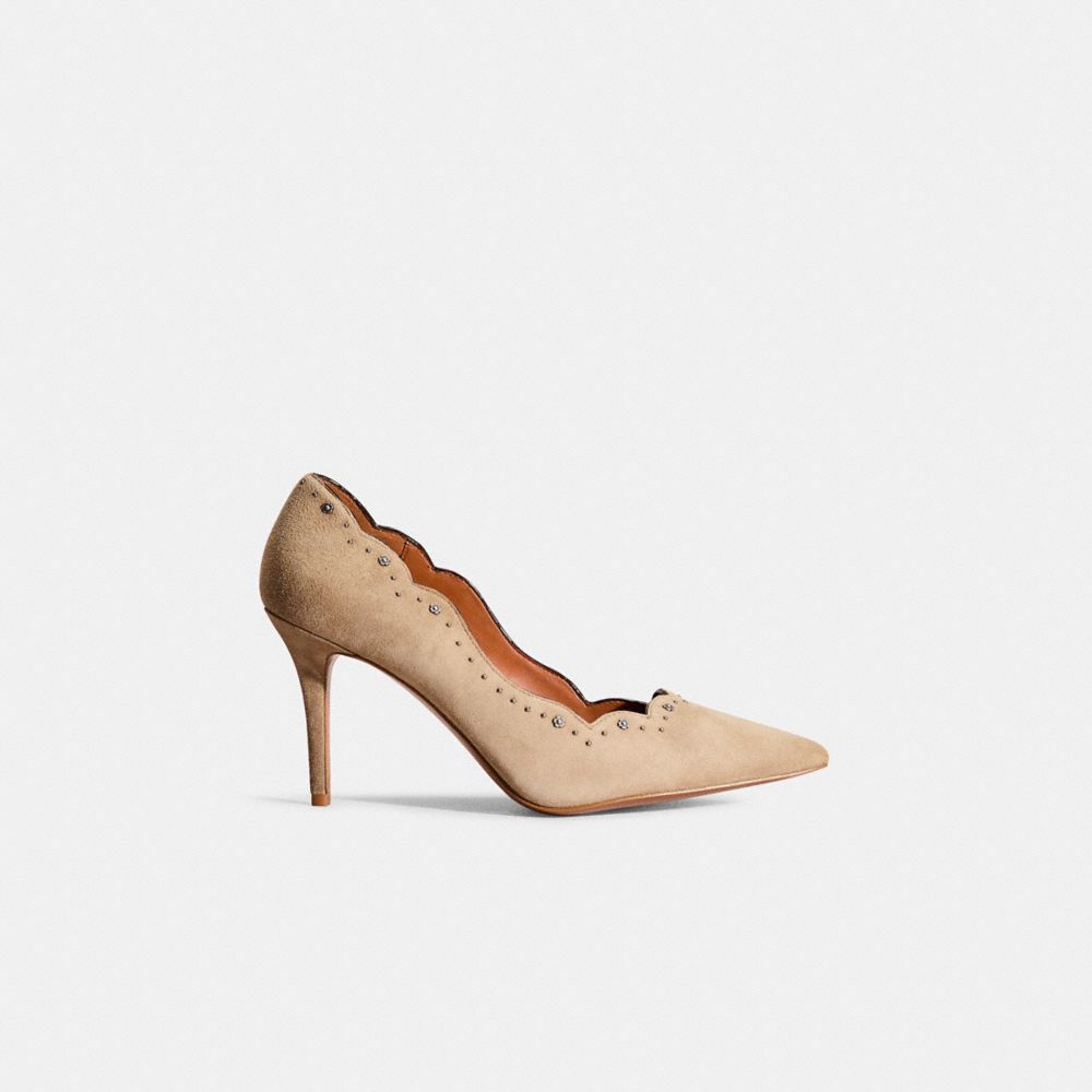 Crafted of soft suede, this versatile pump is perfect for day or night. Designed with a graceful scalloped edge, it features delicate Tea Rose studs and polished rivet detailing for an elegant touch.
