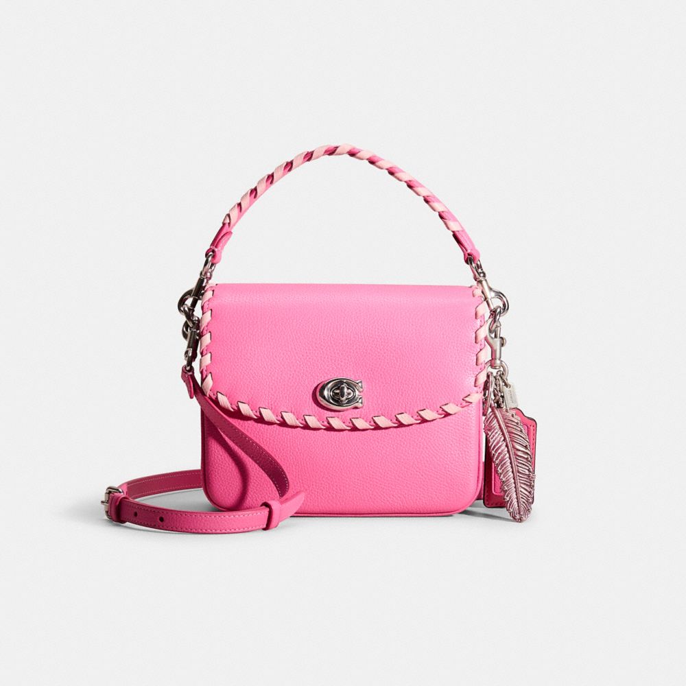 Reimagined with a pretty-in-pink pop of color by Eunice Chang featuring sleek hand-laced whipstitching for a graphic edge, this flap-front style has been expertly cleaned, conditioned and restored. Our talented craftspeople Nicole Izquierdo and Yngrid Pichardo Baez embellished the handle and flap with rich whipstitching, then added a playful repurposed charm. The polished pebble leather Cassie 19 is finished with a Signature turnlock closure and three interchangeable straps for versatile styling, including a playfully romantic leather-wrapped heart chain. Detach the crossbody strap and carry by hand with the leather and chain top handles together or separately.