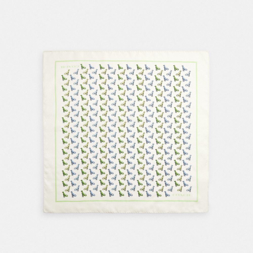 Prête pour passer du bon temps, cette écharpe en soie légère est ornée d’un motif de dinosaure T-Rex dynamique. Complétée par une bordure fleurie, elle peut s’enrouler autour du cou ou se nouer sur les épaules pour ajouter une touche de couleur vive à votre look.