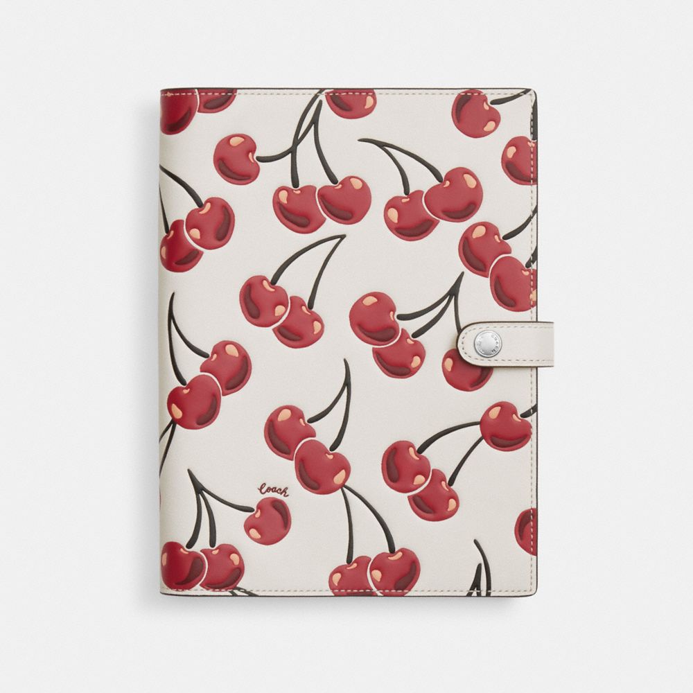 Your notes, ideas and to-do lists have a home in this leather Notebook with cherry print cover. Crafted of smooth leather, this leather notebook also features a spiral binding and snap closure. Ideal for school, work, or personal journaling—take it wherever you go to capture every thought.