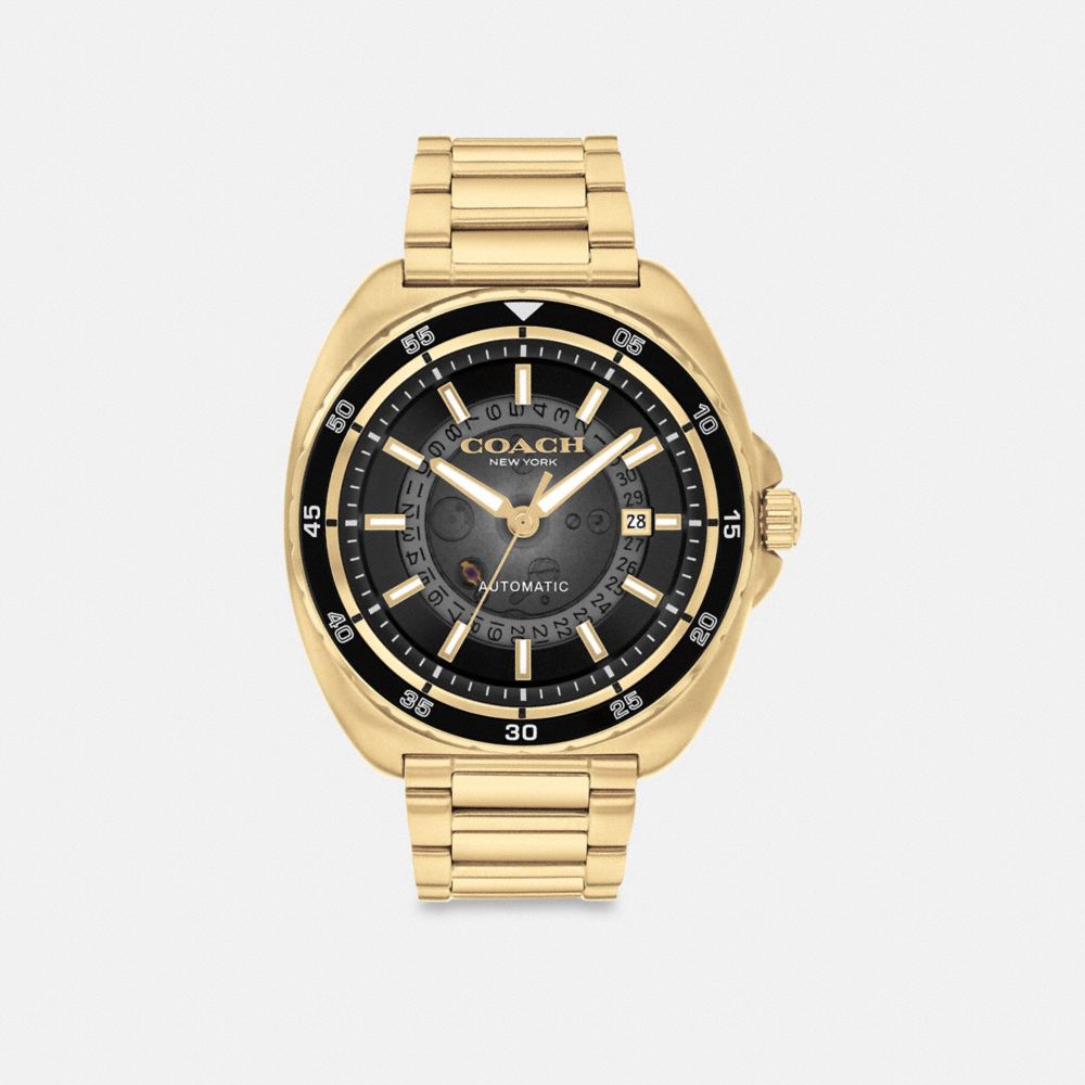 Conçue pour la vie active, la Charter est une montre sportive multifonction faite pour l’aventure. Ce modèle ton or est doté d’un cadran teinté dégradé à rayons avec suivi et d’une fenêtre de date à 3 heures. La fenêtre arrière du fond du boîtier ouvert met en valeur le mouvement automatique.