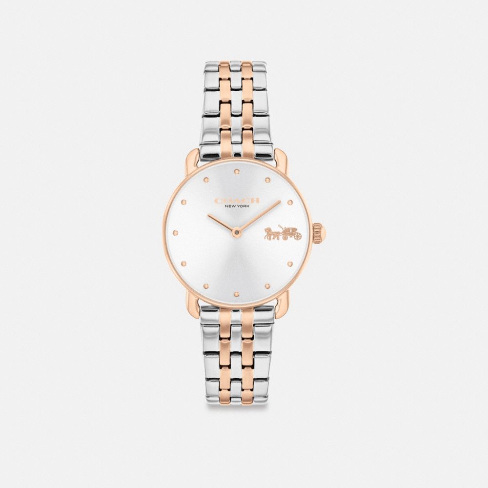 Avec des lignes épurées et une sensibilité minimaliste moderne, la montre Elliot est une véritable conception classique pour le travail ou les fins de semaine. Cette montre à bracelet bicolore en acier inoxydable et ton or est caractérisée par un cadran orné de marqueurs en forme de dôme et de notre emblématique motif cheval et chariot à 3 heures pour une touche héritage.