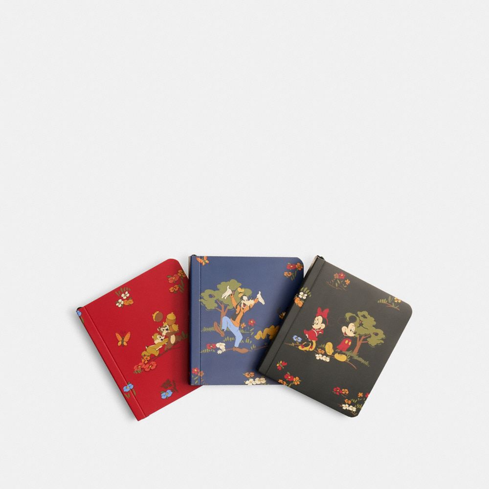 Les personnages bien-aimés de Disney et le design Coach iconique se rencontrent dans cette collection spéciale mettant en vedette le seul et unique Mickey Mouse et ses amis. Cet ensemble de carnets comprend trois modèles compacts avec Mickey Mouse, Minnie Mouse, Donald Duck, Dingo, Pluto, Chip et Dale profitant d’une journée au parc. Il est parfait pour les griffonneurs, les preneurs de notes, les auteurs de listes et les amoureux de Disney de tous âges.
