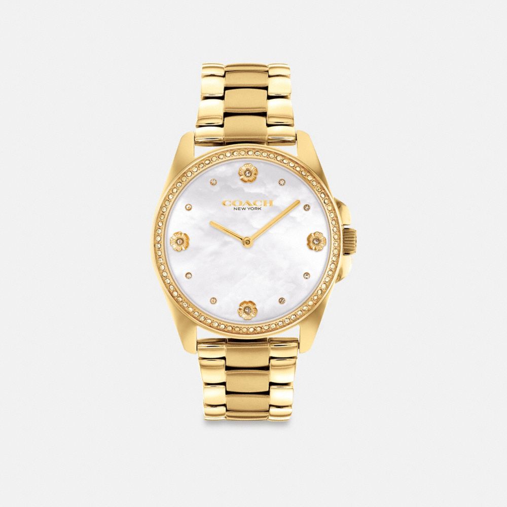 Incarnation de la sophistication raffinée, Greyson est une montre soignée et passe-partout. Ce bracelet élégant ton or brille de mille feux grâce à sa lunette en cristal et à son cadran nacré lumineux orné de nos marqueurs rose thé pour une touche emblématique.