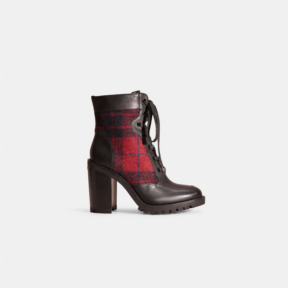 Inspired by the ease and style of traditional hiking boots, the Hedy is reimagined for city streets with a walkable block heel and rubber lug sole for increased traction. Crafted in a mix of rich leather and a heritage plaid wool, the lace-up style is finished with a diminutive charm featuring our iconic Horse and Carriage.