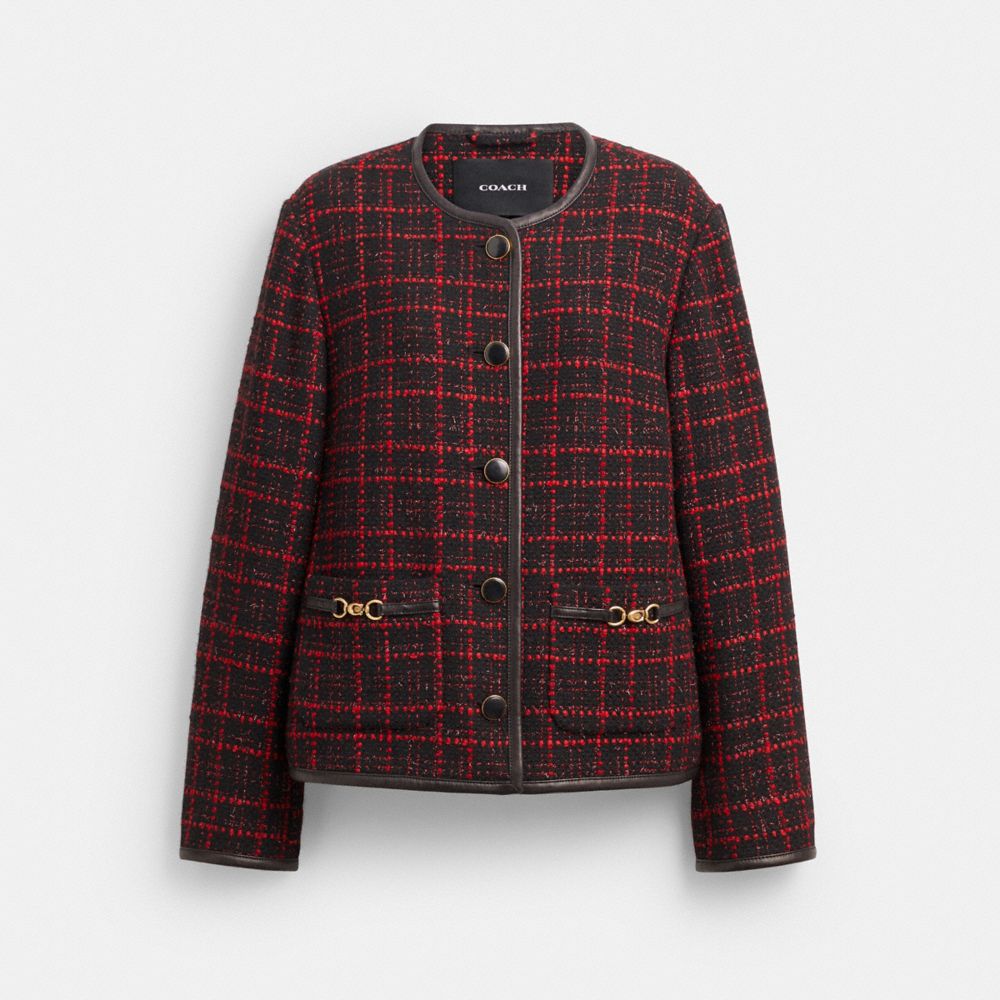 Une version moderne d’un style élégant et intemporel, cette veste en tweed à coupe décontractée est caractérisée par des poches plaquées ornées de notre garniture métallique en C en relief et d’une garniture en cuir souple. Confectionnée en mélange de coton bouclé léger, elle est conçue sans col et comprend des boutons en laiton. Portez-le avec une jupe assortie pour un look coordonné.