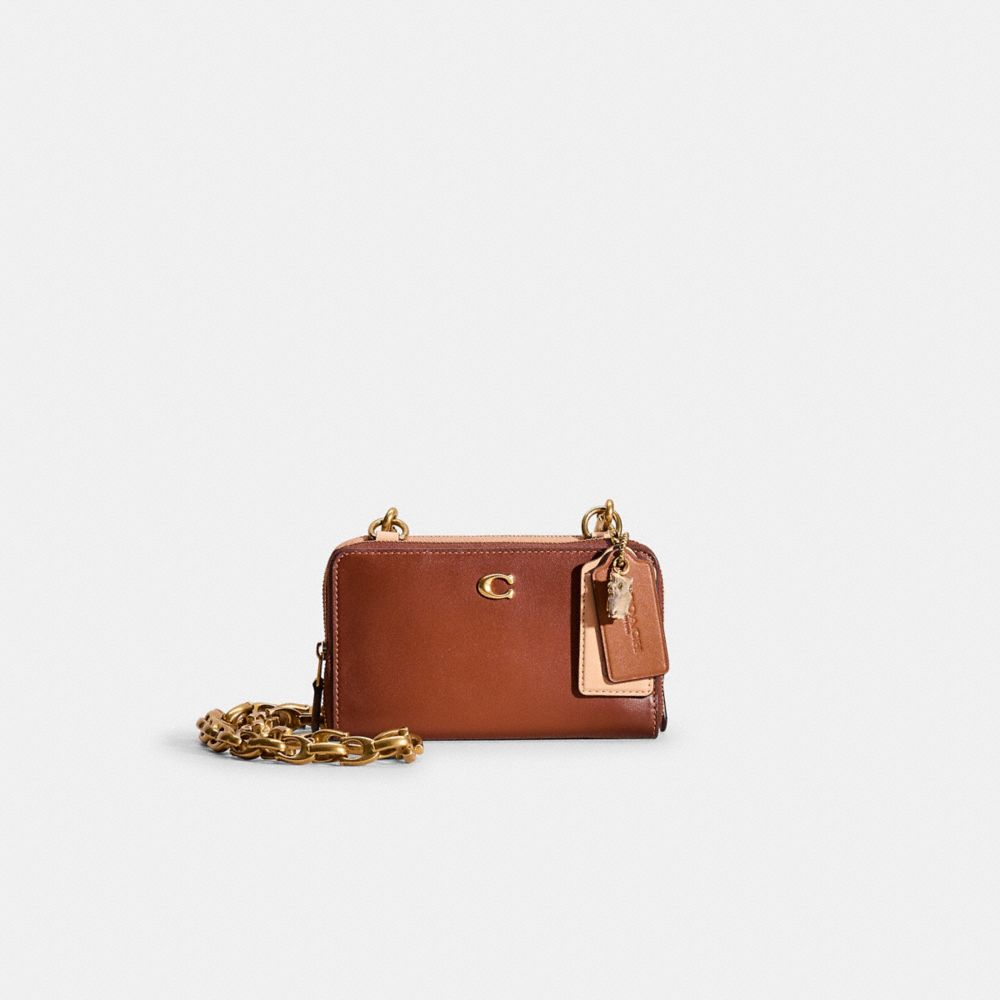 Reimagined from two individual wallets as a chic crossbody design with an edgy-cool chunky Signature chain strap by Eunice Chang, this hybrid style has been expertly cleaned, conditioned and restored. Our talented craftspeople Jose Reyna, Alfred Deaza and Yngrid Pichardo Baez sewed two wallets back-to-back, hand-decorated the interior of one with a Coach patch and a leather Tea Rose on the other, attached a distinctive Signature chain strap with anchors, then added a playful repurposed charm. Crafted of refined leather detailed with our Signature hardware, each wallet unzips for easy access to the well-organized interiors. Each one features ten card slots, a full-length bill compartment and a zip coin pocket.