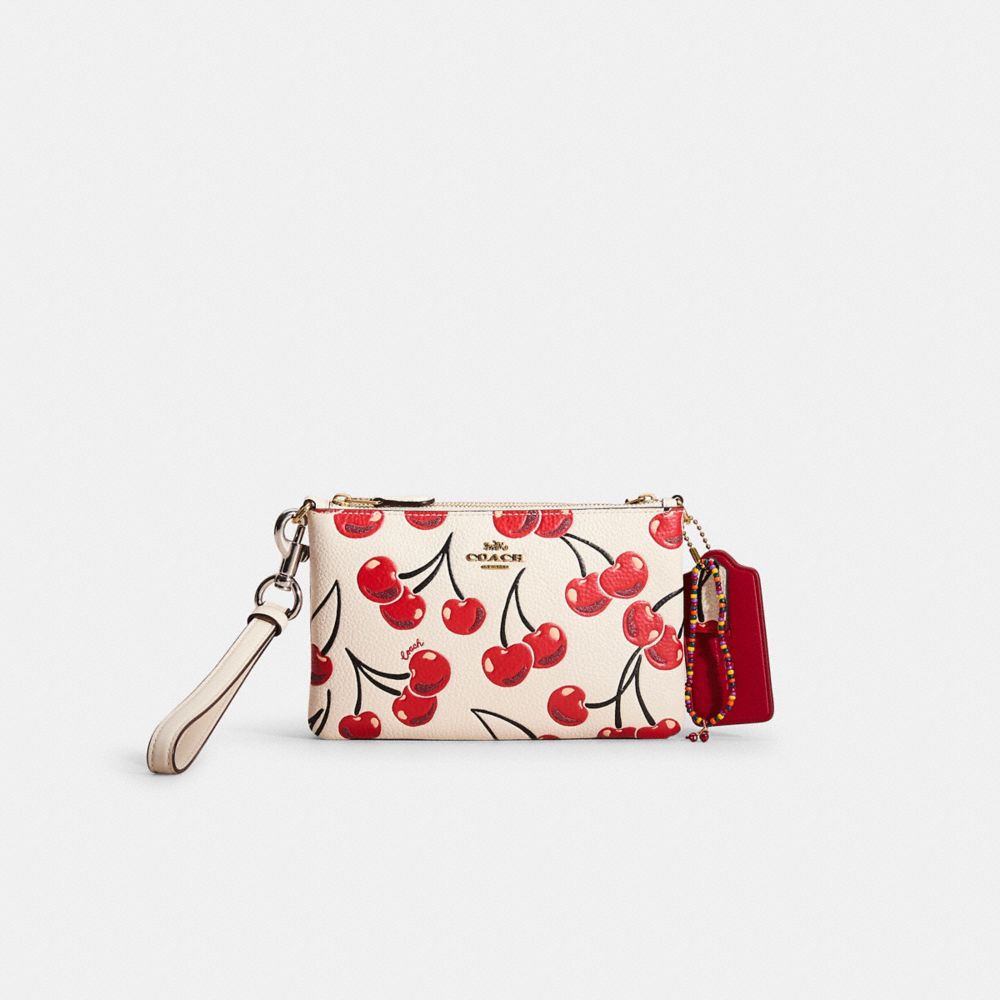 Reimagined from two individual wristlets into a sweet crossbody design by Eunice Chang with double the space and double the organization, this hybrid style has been expertly cleaned, conditioned and restored. Our talented craftsperson Jose Reyna sewed two wristlets together, re-attached the wristlet strap, spot-painted the corner, then added a chunky chain and leather shoulder strap and playful repurposed charm. Crafted of polished pebble leather featuring a cheerful cherry print, this wristlet is perfectly sized for cards, cash and a phone. Finished with smooth leather details, wear it on your wrist, on your shoulder or clip it inside a larger Coach bag.