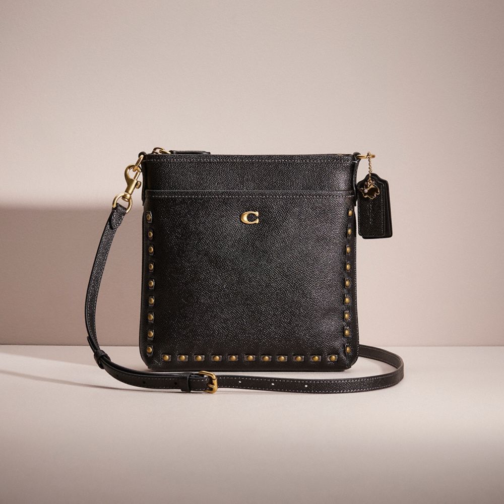 Reimagined by Savannah Sutton with sleek hand-laced pick stitching accented with gleaming rivets for a sophisticated finish, this slender style has been expertly cleaned, conditioned and restored. Our talented craftspeople Jose Reyna and Yngrid Pichardo Baez hand-decorated the front with riveted pick stitching, replaced the Signature hardware, painted the corners and added a playful repurposed charm. Crafted of scratch resistant crossgrain leather featuring our Signature hardware, the Kitt Messenger is a versatile crossbody perfect for weekends or travel. An exterior pocket gives easy access to essentials.