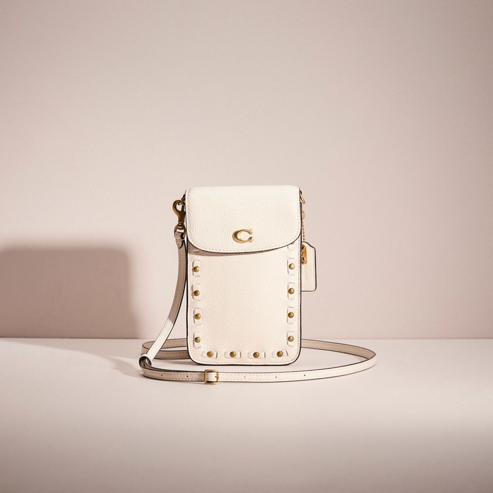 Reimagined by Savannah Sutton with sleek hand-laced pick stitching accented with gleaming rivets for an edgy-cool vibe, this streamlined style has been expertly cleaned, conditioned and restored. Our talented craftspeople Jose Reyna, Nicole Izquierdo and Yngrid Pichardo Baez hand-decorated it with riveted pick stitching along the edges and added a playful repurposed charm. Pare down and tote the essentials with our Phone Crossbody. Crafted of polished pebble leather detailed with our Signature hardware, the compact design has space to hold the largest size phone and a convenient exterior slip pocket. Wear it crossbody with the detachable strap or slip inside of a larger bag.