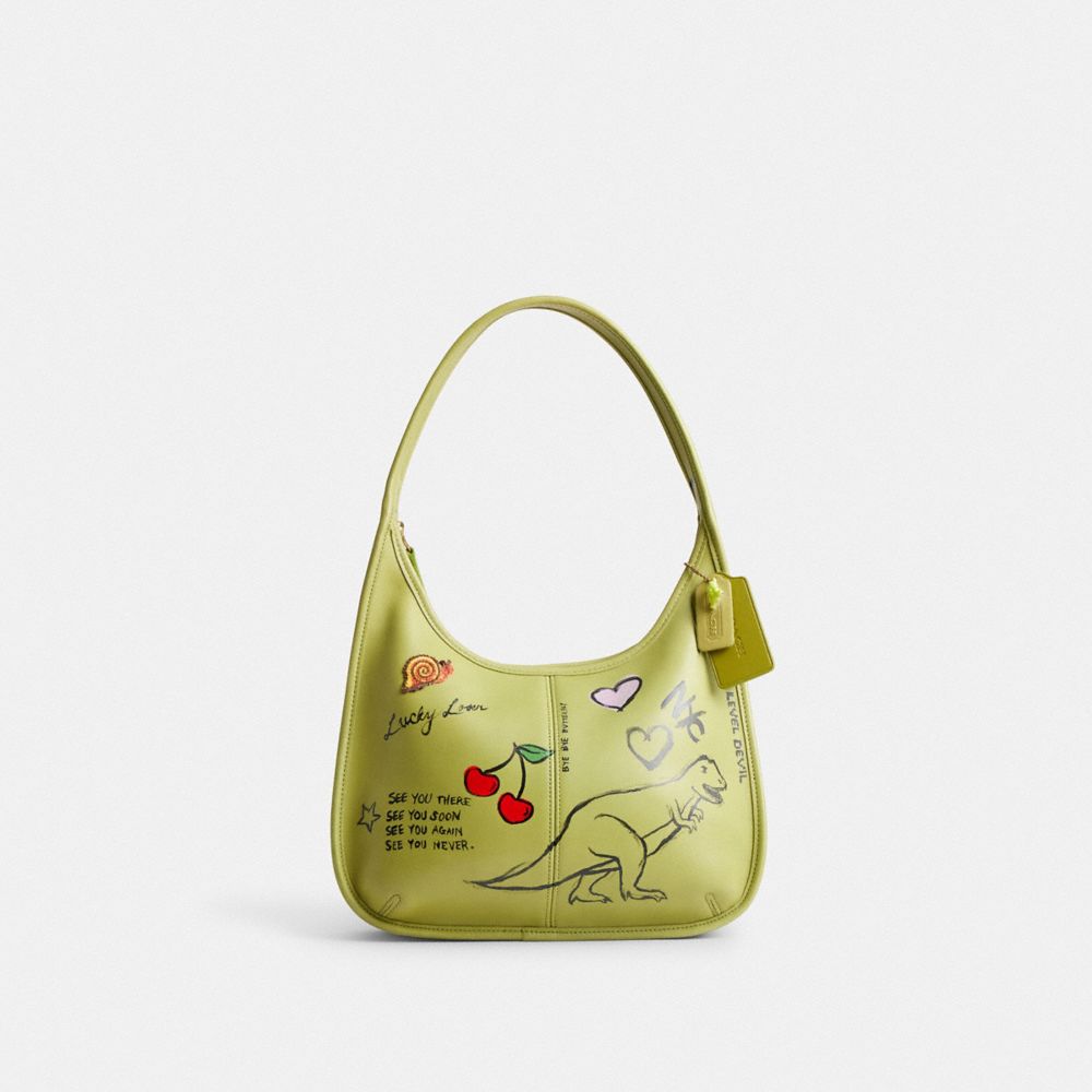 Vibrantly hand-painted by Rose Oliva with an imaginative Coach diary doodle motif inspired by youthful rebellion and the creative expression of artistic notebook scribbling, this vintage zip-top style has been expertly cleaned, conditioned and restored. The dynamic artwork mixes a roaming dinosaur, New York taxi and snacks, cherries, hearts and stars with clever thoughts and phrases. Our talented craftsperson Jose Reyna applied a salvaged embroidered snail patch to the front, repaired threads on the zipper pull, then added a playful tonal repurposed charm. Crafted of buttery soft glovetanned leather, this vintage Ergo Zip Bag is a beloved Coach silhouette first introduced in 1997. The zip-top hobo style features an inside pocket for easy organization.