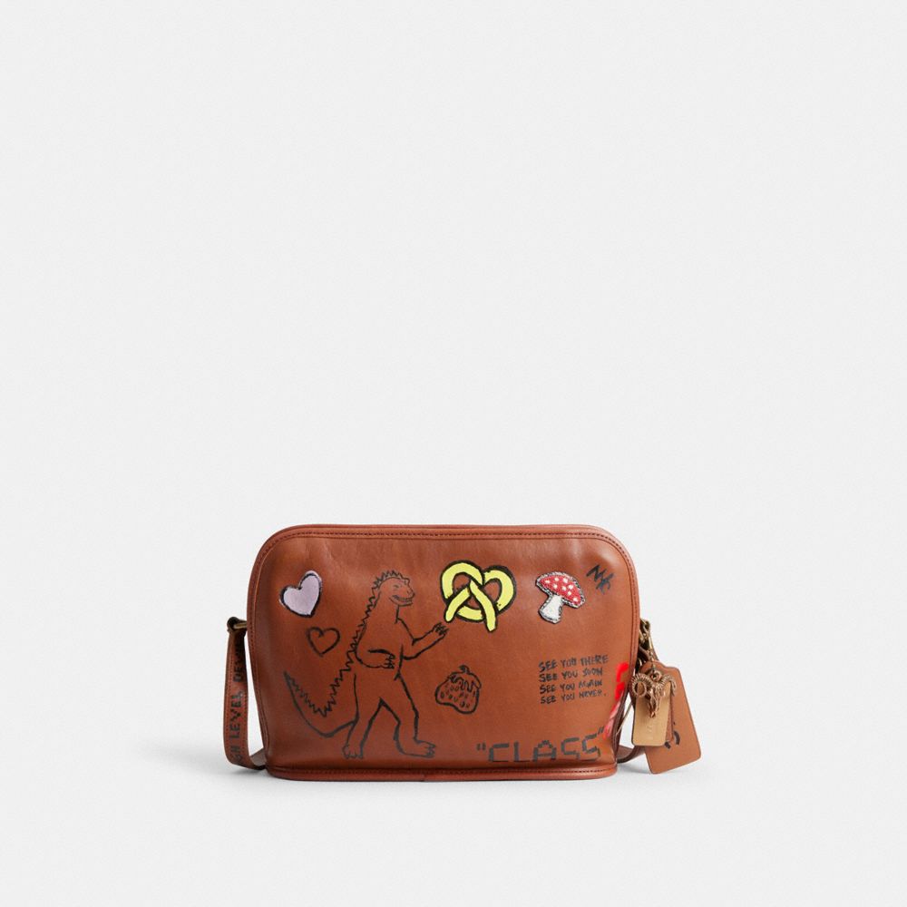 Intricately hand-painted by Rose Oliva with an imaginative Coach diary doodle motif inspired by youthful rebellion and the creative expression of artistic notebook scribbling, this vintage style has been expertly cleaned, conditioned and restored. The dynamic artwork mixes a roaming dinosaur, New York snacks, butterflies, hearts and a clover with clever thoughts and phrases. Our talented craftsperson Jose Reyna applied a salvaged embroidered mushroom patch to the front, replaced the binding, then added a playful tonal repurposed charm. Crafted of buttery soft glovetanned leather, this vintage Oliver Bag is a beloved Coach silhouette first introduced in 1992. The zip-top style features pockets inside and out for easy organization.