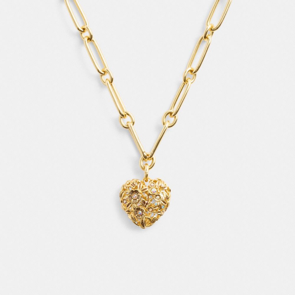 Montrez un peu d’amour (vintage). Inspiré des styles anciens, ce collier court à pendentif cœur doré est doté d’une diffusion d’icônes Coach bien-aimées complétés d’éclats de cristaux scintillants. La chaîne à maillons est dotée d’un fermoir.